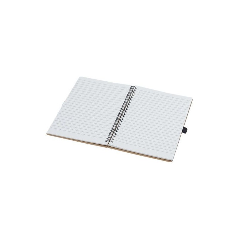 Carnet A5 à spirales avec couverture en carton recyclé et boucle pour stylo. Contient 70 feuilles lignées de 60 g/m² fabriquées en pierre. Le papier de pierre n'utilise aucun arbre et le processus de production consomme moins d’énergie que celui du papier recyclé ou de nouvelle pâte à papier. Ce papier est résistant à l’eau et aux déchirures et se caractérise par une couleur blanche naturelle (pas de blanchiment).NaturelCarton recyclé, Papier de pierreTampographie - Devant - 55 x 55 x Ø 70 mm - max couleurs : 4.